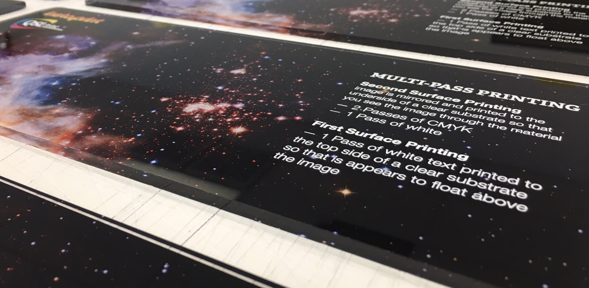 Combining imagery from two sides of a clear substrate requires a direct-to-substrate printer. First, we printed a mirror image of the Hubble photograph. This is called second-surface printing and it allows the image to be viewed through the substrate.